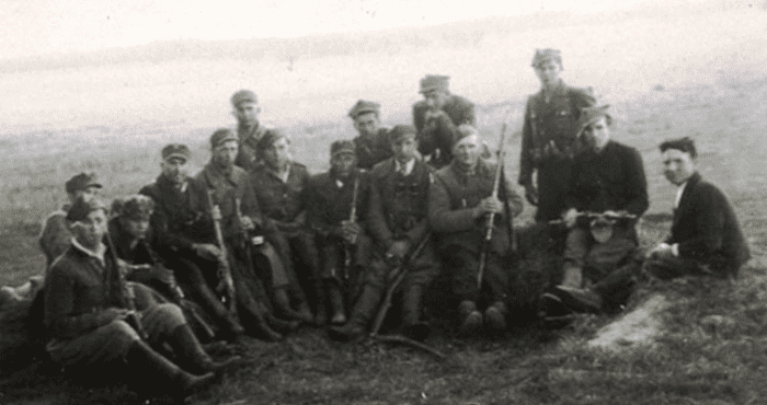 Польський підрозділ Національних збройних сил (НЗС) Перед строєм стоять Юзеф Задзерський (“Волиняк”), Станіслав Пельчак (“Майка”), Броніслав Глиняк (“Радван”). Джерело: фото: History Ukraine